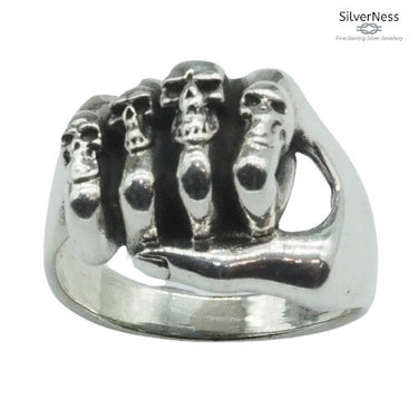 This distinctive ring features four skulls arranged in a fist, symbolizing strength and determination.